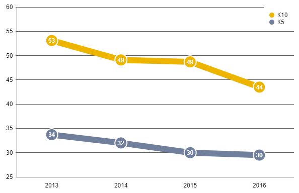 Расчеты показывают, что для категории «Кондитерских изделий» суммарная доля десяти ведущих брендов (показатель К10) в данном случае составляет лишь 43%. Эта доля одна из самых небольших среди всех проектов, рассматриваемых в исследовании «Любимые бренды россиян». Для сравнения: в близкой категории «Шоколадные батончики» аналогичный показатель почти в два раза больше. При этом, уровень брендированности категории «Кондитерские изделия» еще и падает. В 2016 году этот показатель снизился на 10 пп. в сравнении с 2013 годом. Аналогично ведет себя и показатель К5, вычисляемый как суммарная доля пяти лидеров.