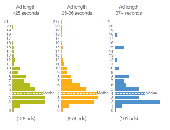 Исследовательская компания Millward Brown в ходе тестирования рекламы составляет комплексный «Индекс известности бренда» (Awareness Index), в который в числе прочего входит и показатель «Воздействие рекламы», также известный как «запоминаемость бренда» (branded memorability). Как показывают эмпирические данные, показанные на диаграмме, AI варьирует в широких временных рамках в роликах любой длины. Поэтому, если основной целью кампании является создание «рекламного давления», нет причины искать какую-то особенную, «самую лучшую» длину ролика. Для этого есть и еще одна причина.