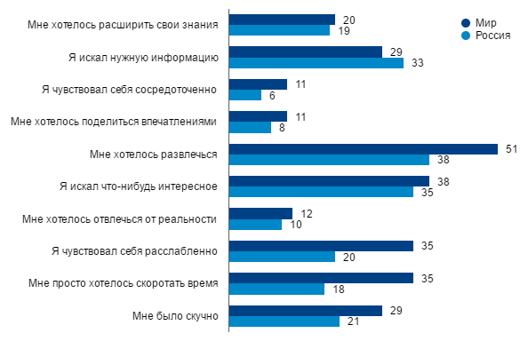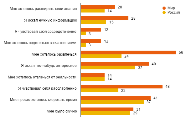 Заметим, что, хотя в целом, россияне не слишком отличаются от среднестатистического «гражданина мира», но некоторые отличия все же есть. Например, россияне в значительно меньшей степени, чем в других странах, смотрят телевизор с целью найти нужную информацию. Наши сограждане не склонны делиться информацией просмотренных телепрограмм с друзьями и реже, чем в других странах, садятся перед «голубым экраном» или берут в руки смартфон, когда хотят развлечься или расслабиться. А что они делают чаще, чем за рубежом? Больших различий обычно не наблюдается, разве что для поиска чего-либо интересного у нас чаще, чем в других странах, используют телевизор, подключенный к Интернету. Читатель может самостоятельно сравнить данные по России (таблица выше) и миру в целом (таблица ниже).