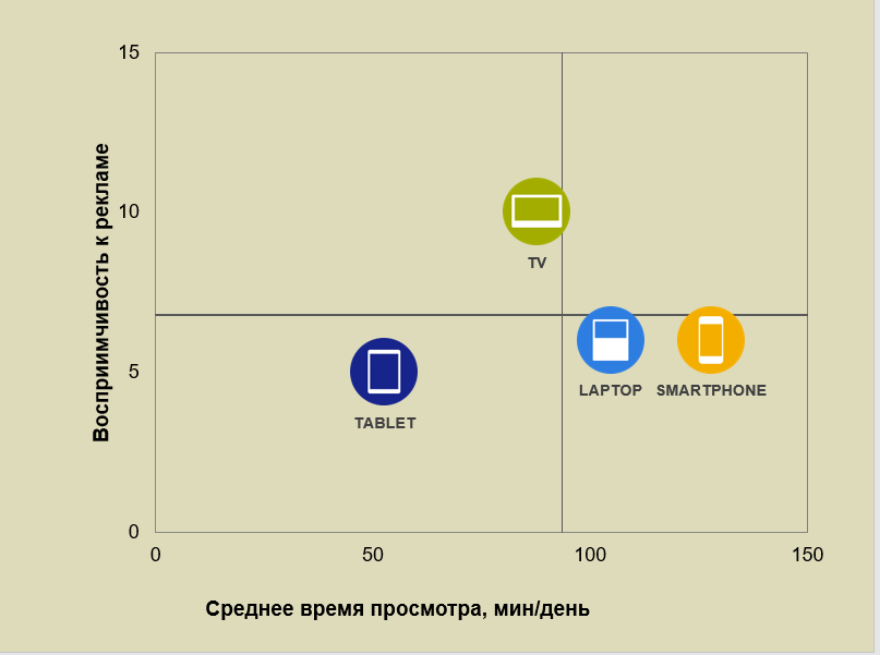 Уровень восприимчивости к рекламе на различных устройствах и время их использования