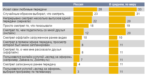 Из представленной таблицы различия в отношении к разным экранам видны невооруженным глазом. Основное отличие, скажем, традиционного телевизора от смартфона и, тем более, компьютера в том, что зритель пассивен. Сидя перед «голубым экраном», он хочет убить время, борется со скукой. Причем, это мировая тенденция. Ниже мы приводим подробные ответы на один из вопросов: о том, как именно люди выбирают то, что они собираются смотреть.