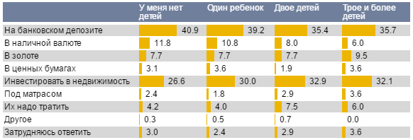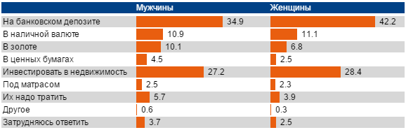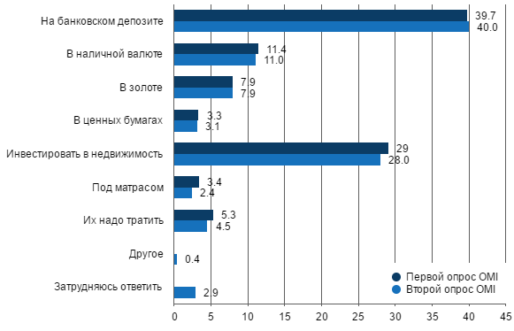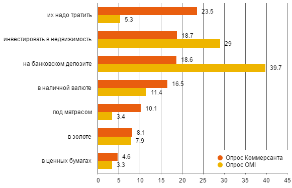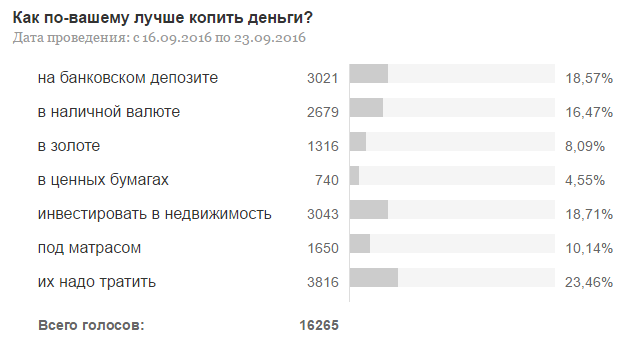 В конце сентября 2016 года редакция ИД «КоммерсантЪ» провела на собственном сайте опрос, задав своим посетителям всего один вопрос: «Как по-вашему лучше копить деньги?». На него откликнулось (в прямом смысле) свыше 16 тысяч человек. Большинством голосов посетители сайта решили, что деньги надо тратить. Мнения тех, кто предпочитает «копить», разделились. Одни говорили, что надо вкладываться в недвижимость (18,7%), другие – держать на банковском депозите (18,6%), третьи предпочитали наличную валюту (16,5%). Были и более экзотические варианты, например, держать деньги в золоте или «под матрасом». Впрочем, вот скриншот с первоисточника.