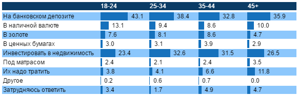 В данном случае отсутствие варианта «другое» не повлияло на конечный результат, что хорошо видно из диаграммы. Но бывает и по-другому, если составители анкеты упустят какие-то актуальные для аудитории варианты ответа. В данном случае, такими «упущенными» вариантами было накопление в криптовалюте или биткоинах, игра на бирже или Forex, однако таких ответов было очень мало, что и показала проверка.