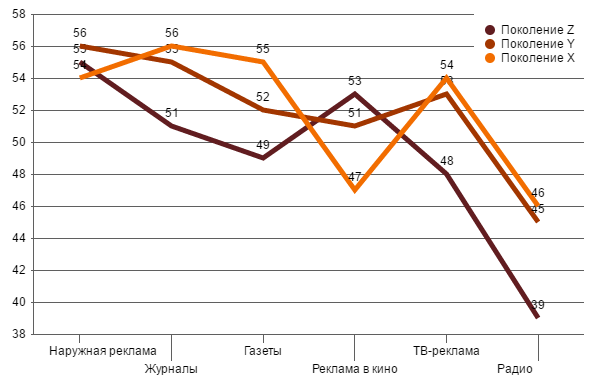 Негативное отношение людей к ТВ-рекламе стало уже общим местом, однако юные респонденты, так называемые «зеты», как ни странно не испытывают к ней отвращения. Во всяком случае, доля положительных ответов представителей поколения Z на 11 пп. выше, чем у «иксов». О причинах можно только догадываться, хотя сделать это нетрудно: стаж телесмотрения «зетов» пока невелик, реклама не успела приесться, да и ее создатели, видимо, сейчас работают не столь прямолинейно как 10-15 лет назад. Похожие, но не столь явно выраженные зависимости можно видеть в категориях журналов и газет. А вот к «лидеру мнений» – наружной рекламе – старшее поколение относится даже лучше, чем «зеты» и, тем более, «игреки». Среднее же поколение, т.е. «игреки», наиболее скептично относится к рекламе в целом, во всяком случае, в ее традиционном виде.