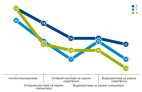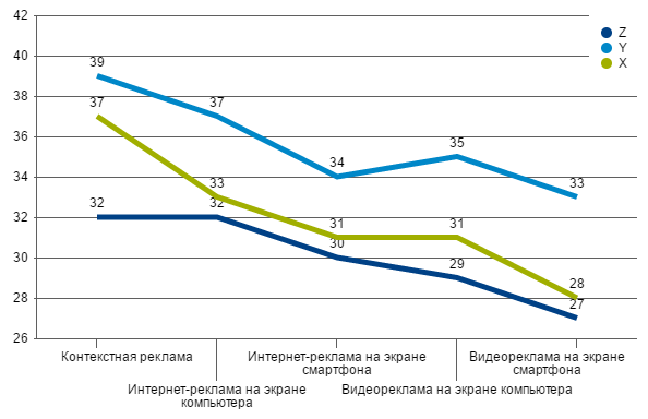 Отношение к рекламе, восприимчивость к ней и реакция на креатив в большой степени зависит от возраста людей, причем, эти связи сложны и часто не очевидны. Такой вывод можно сделать из результатов глобального проекта компании Kantar Millward Brown - «AdReaction: привлечение поколений X, Y and Z», результаты которого были опубликованы в начале 2017 года. В ходе исследования были опрошены 23 тысячи человек в возрасте 16-49 лет из 39 стран, включая Россию. Исследователи выделили три возрастные группы, следуя известному делению на поколения: X (35 – 49 лет), Y (20 – 34 года) и Z (5 – 19 лет), разумеется, в последнем случае нижний возрастной предел респондентов данного исследования был выше, т.е. не пять, а шестнадцать лет. Результаты опроса позволили определить отношение каждой поколенческой группы к различным видам рекламы. Исследование охватывает почти сорок стран, однако здесь мы будем рассматривать, в основном, российские данные, сравнивая их в отдельных случаях с среднемировыми показателями.