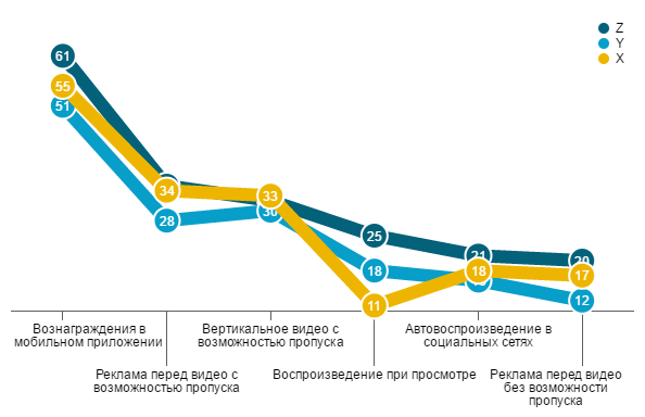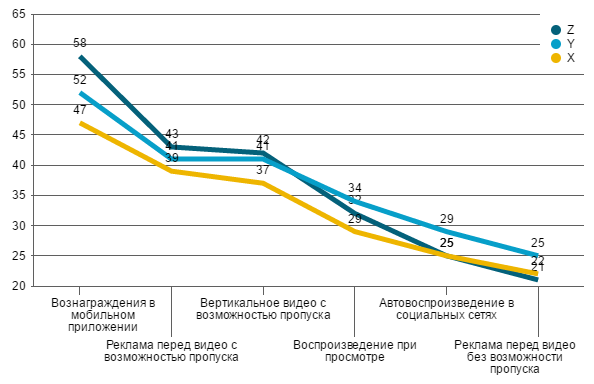 Сравнивая глобальные данные отношения респондентов к видеорекламе с российскими, можно заметить, что в первом случае возраст людей имеет большее значение почти во всех случаях. Общая закономерность ожидаема: чем старше респондент, тем больше его раздражает видеореклама. При этом общий уровень лояльности к такой рекламе в среднем по миру выше, чем в России. Интересно, что в одних случаях самыми позитивно настроенными оказывались самые юные респонденты (это касается таких форматов как вознаграждения за просмотр в мобильном приложении и реклама с возможностью пропуска), а других – люди среднего возраста (поколение Y), причем, различия были статистически значимыми.