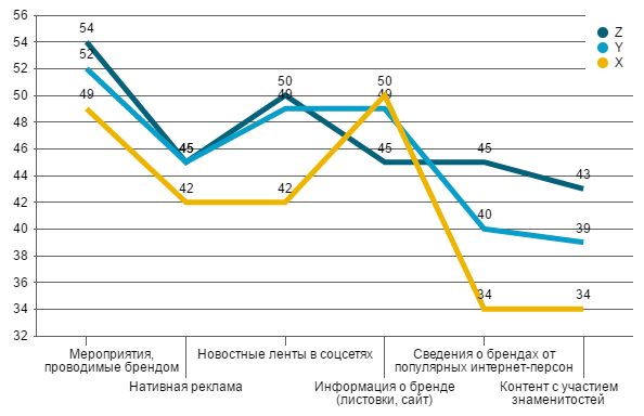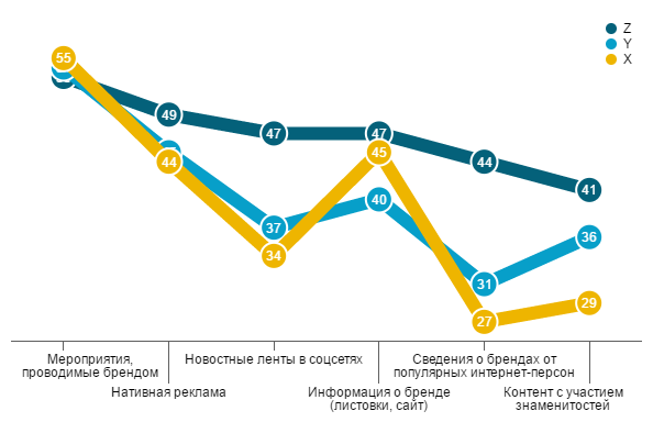 - Молодые люди, входящие в группу «поколение Z» значительно лояльнее, чем «игреки» и «иксы» к появлению сообщений брендов в новостных лентах соцсетей и упоминаниях брендов популярными в Интернете персонами. Отдельно отметим, что превышение показателей лояльности «зетов» является статистически значимым.