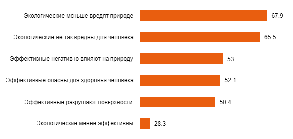 Мы спросили, они ответили, диаграмма ниже. Под «экологическими» чистящими средствами здесь понимаются товары с соответствующей надписью на упаковке. Под эффективными – обычные чистящие средства, которые, как предполагается, «более эффективны». Респонденты должны были выразить свое степень своего согласия или несогласия с несколькими утверждениями. Мы взяли прямо из жизни: это обычные представления о чистящих средствах. Цифры на диаграмме означают совокупную долю тех, кто «полностью согласен» или «скорее, согласен» с утверждениями.