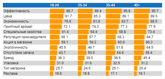Возраст ожидаемо оказывает влияние на факторы выбора. Но не все. Как видно из приведенных данных, если и выделять «возрастную нишу», то ее отличительными признаками могут быть такие факторы как «запах» (и его отсутствие), «специальные свойства», «экологичность», но не «бренд», «упаковка» или «репутация производителя».