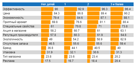 Зависимость важности факторов выбора чистящего средства от числа детей, доля, %