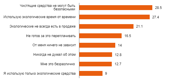 Как легко видеть, лишь 9% утверждают, что они используют только экологические средства, а еще 27,4 – время от времени (эти цифры можно суммировать, так что получается больше трети). И это при том, что более 50% респондентов утверждают, что экологичность – для них важный фактор выбора. Значит, потенциально это ниша может быть интересна. Но что мешает?