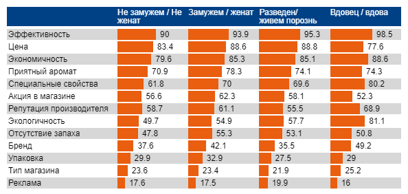 Семейный статус респондента не слишком сильно влияет рейтинг факторов выбора. Можно обратить внимание разве что на повышенное внимание к эффективности и экономичности (но не цене!) людей, семейная жизнь которых не вполне удалась (разведенные и вдовы). А еще они значительно внимательнее относятся к экологичности чистящего средства. Для ниши этого маловато, но это только начало анализа.
