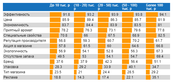 Зависимость важности факторов выбора чистящего средства от среднего дохода покупателей (в пересчете на одного человека), доля, %