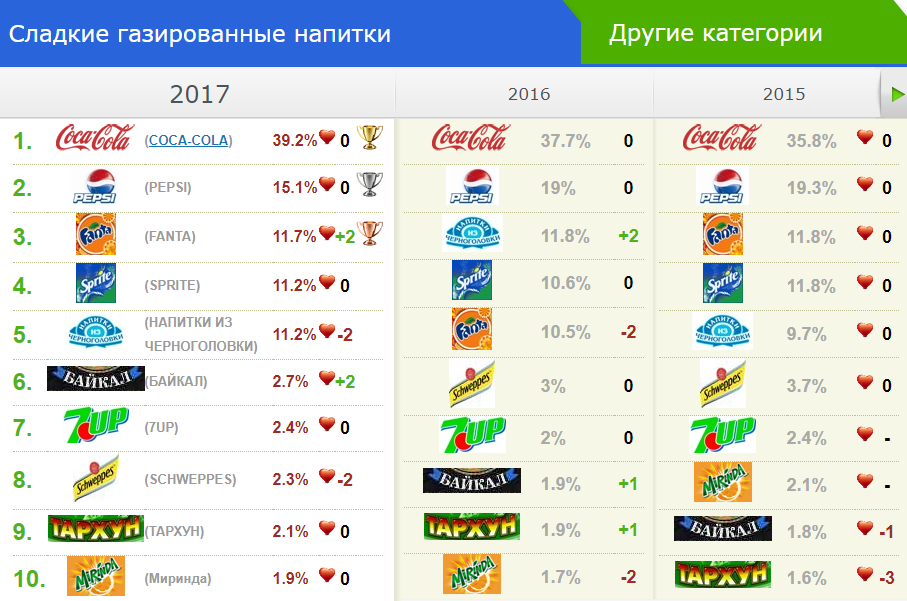 Рейтинг TOP-10 брендов категории Сладкие газированные напитки», 2017 – 2015 гг.