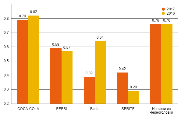 И это, в общем-то, все. Новостей, конечно, много, но вряд ли респондентов интересует бизнес-новости типа смены гендиректоров (а это было). Скорее, простых людей порадует появление в линейке нового вкуса по типу «а теперь с семечками» или газировка со вкусом огурца (примеры реальные). Но такие примеры есть у всех рассматриваемых нами брендов. Словом, события не дают повода делать выводы, разве что Coca Cola все же выглядит активнее своего «вечного конкурента». Второй вывод мы уже делали: «Напитки из Черноголовки» имеют потенциал вырваться вперед. Но и тут пока мы можем говорить только о потенциале.