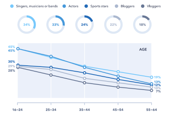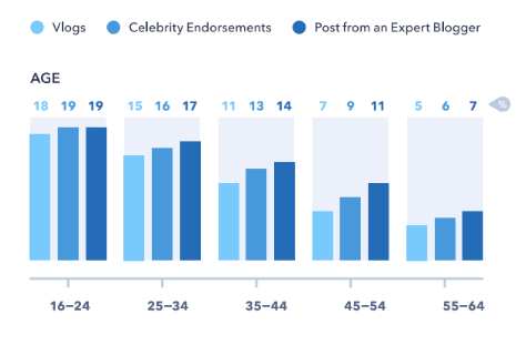 Помимо тематических новостей от известных людей, их подписчики узнают еще и о брендах, сервисах и продуктах, ведь не "пройти мимо" рекламных постов сложно. Разумеется, молодые люди в большей степени подвержены мнению инфлюенсеров, чем люди постарше, но есть нюансы. Доля немолодых людей, которые узнают о бренде из влогов, от блоггеров-экспертов или из рекомендаций селебритиз, по большому счету, ненамного меньше ставшей классической "молодежной аудитории". Например, рекламная информация о бренде «доходит», примерно, до каждого пятого молодого человека в возрасте до 24 лет, причем, независимо от типа канала. Доля «усваиваемости» рекламной информации людьми постарше ниже (особенно, если речь идет о влогах), но ненамного. Например, 7% людей категории 55+ узнают о товарах и услугах от экспертов-блогеров, а среди возрастной аудитории 45-54 лет эта доля составляет 11%.