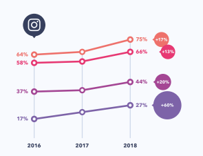 Причем, это только начало. Данные другого и так же глобального отчета globalwebindex, посвященного использованию соцсетей представителями разных поколений, говорят о том, что доля пожилых пользователей соцсетей, и особенно Instagram, растет быстрее, чем в других социальных категориях. «Стартовые позиции», разумеется, не равны, ведь в 2016 году этой сетью пользовалось лишь 17% людей в возрасте 55+. Однако, тот факт, что спустя всего два года, в Instagram «сидит» уже каждый четвертый пожилой человек, говорит о многом. По данным исследователей, доля пожилых пользователей Instagram в период 2016-2018 годов выросла на рекордные 60%