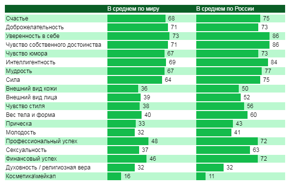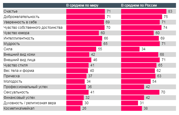 В то же время, только треть россиян считают сильных женщин красивыми, в то время, как в Мексике таковых оказалось аж 85%. Также для жителей нашей страны не играют решающей роли в создании красивого образа такие характеристики как финансовый и профессиональный успех, и, что интересно – интеллигентность. Несмотря на то, что доля указавших интеллигентность россиян (69%) даже немного выше глобальной, отставание от Мексики (85%) можно считать значительным. Также интересно отношение россиян к такому понятию как духовность. Эту характеристику назвал каждый третий респондент, что вполне соотносится со средним показателем по миру, однако, показатели Бразилии, Индии и Турции (примерно 50%) значительно выше. Не говоря о Саудовской Аравии – 72%, что вполне объяснимо.
