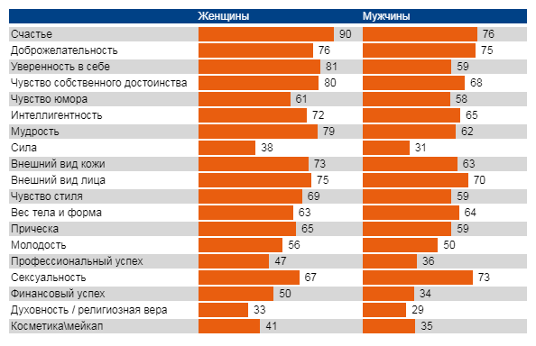 Российские мужчины и женщины видят женскую красоту в целом одинаково, однако, различия также имеют место. Например, такой компонент как счастье оказался важным практически для всех женщин (90%), в то время как доля мужчин значительно меньше – 76%. Впрочем, в остальном мире мужчины жалуют счастливых женщин еще меньше, например, в Германии таковых оказалось меньше половины.