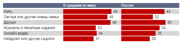 Почти каждая вторая россиянка прислушивается к советам своих друзей, но сестрам и другим членам семьи доверяет меньше. Журналы и печатные издания имеют больше влияния на российских женщин, чем в среднем по миру, однако, маме и друзьям наши женщины доверяют все равно больше.
