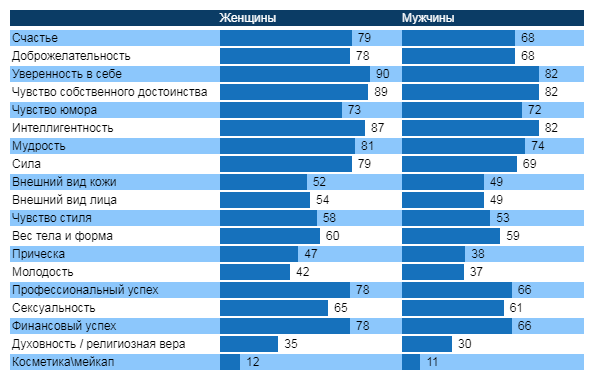 Также ощутимы различия во взглядах российских женщин и мужчин на женский профессиональный и финансовый успех, однако, в целом такой раскол можно считать глобальным трендом. Мудрость российские мужчины тоже часто не считают составляющей красоты, что тоже вписывается в глобальную картину мира.