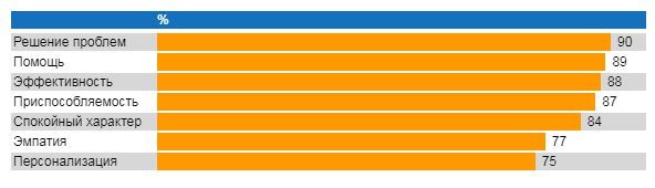 Респондентов попросили выделить важные для них характеристики взаимодействия с брендом. Выяснилось, что потребителям нужно не только решение проблемы, как таковое, хотя именно этот фактор оказался важным для девяти респондентов из десяти, но и много чего еще. Помимо помощи (поддержки) и эффективности, для людей важны такие человеческие качества как спокойный характер и эмпатия. Также люди хотят больше личного отношения – персонализации, и способности подстроиться под клиента – приспособляемости. Именно из этих человеческих составных складывается то самое эмоциональное соучастие.