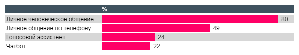 Многие компании все чаще используют автоматизированный подход к работе с клиентами, используя искусственный интеллект для общения со своими клиентами. Однако, как это может сказаться на покупательском опыте, можно только предположить. Респондентам предложили оценить качество взаимодействия по средством разных каналов. Преимущество личного, или, на худой конец, телефонного общения по сравнению с взаимодействием посредством чатбота или голосового ассистента оказалось подавляющим.
