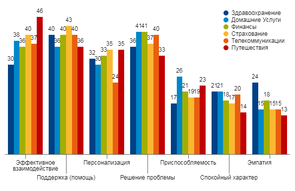 С человеческими характеристиками все совсем плохо. Спокойный характер представителя встречается в лучшем случае один раз из пяти, главным образом, в сфере здравоохранения, а на приспособляемость (способность подстроиться) может рассчитывать в лучшем случае один клиент из четырех. Только 24% респондентов считают, что эмпатию демонстрируют компании из сферы здравоохранения, а в финансовой области доля еще ниже – 18%. Кстати, сотрудники финансовой сферы также крайне редко демонстрируют спокойный характер, хотя казалось бы.