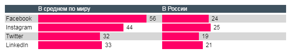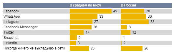 Facebook оказался на данный момент самым популярным соцмедиа. На этой площадке делает публикации каждый второй человек как минимум раз в месяц. На Россию, где самой популярной платформой с долей 58% стал VK, этот тренд не распространяется. В нашей стране регулярно пользуются Facebook чуть больше четверти от всех респондентов. Также, результаты опроса показали, что в России крайне редко делаются публикации в Facebook Messenger (8%), в то время как в развитых странах в этом канале «постит» почти каждый третий. Наши соотечественники не торопятся осваивать Snapchat и LinkedIn, впрочем, и в других странах этими каналами пользуется в лучшем случае один респондент из десяти.