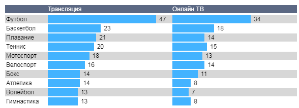 Футбол – самая популярная игра, трансляции которой, смотрят по телевизору почти половина болельщиков. Также этот вид спорта оказался наиболее востребованным среди аудитории онлайн ТВ – 34%. Подавляющее преимущество обычной телетрансляции над онлайн ТВ можно наблюдать по каждому виду спорта, за исключением, разве что, уже упомянутого велоспорта, а также бокса, мотоспорта и тенниса.