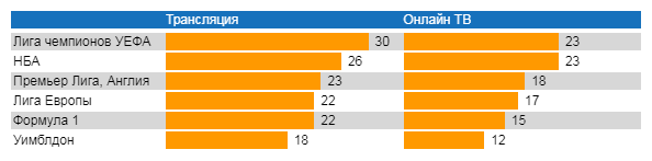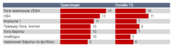 Лигу чемпионов УЕФА в мире спорта можно смело назвать событием номер один, причем, чаще всего эти игры смотрят (в данном случае речь идет только о телевидении) посредством обычной телетрансляции. При этом, популярные соревнования по баскетболу североамериканской лиги НБА любители спорта смотрят посредством обоих каналов почти одинаково. Больше того, эти игры «обошли» Лигу чемпионов по просмотрам по Онлайн ТВ. Также почти поровну разделились доли просмотров среди любителей игр английской Премьер Лиги.