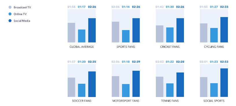 Люди больше смотрят спортивные соревнования посредством соцмедиа. Так, за просмотром футбола и мотоспорта любители спорта проводят в соцсетях в среднем более двух с половиной часов, в то время как на долю обычной телетрансляции приходится только около двух часов. Онлайн ТВ болельщики смотрят еще меньше – в среднем чуть больше часа в день. Интересно, что некоторые виды спорта, например, велогонки и крикет оказались почти одинаково популярны на всех видах ТВ.