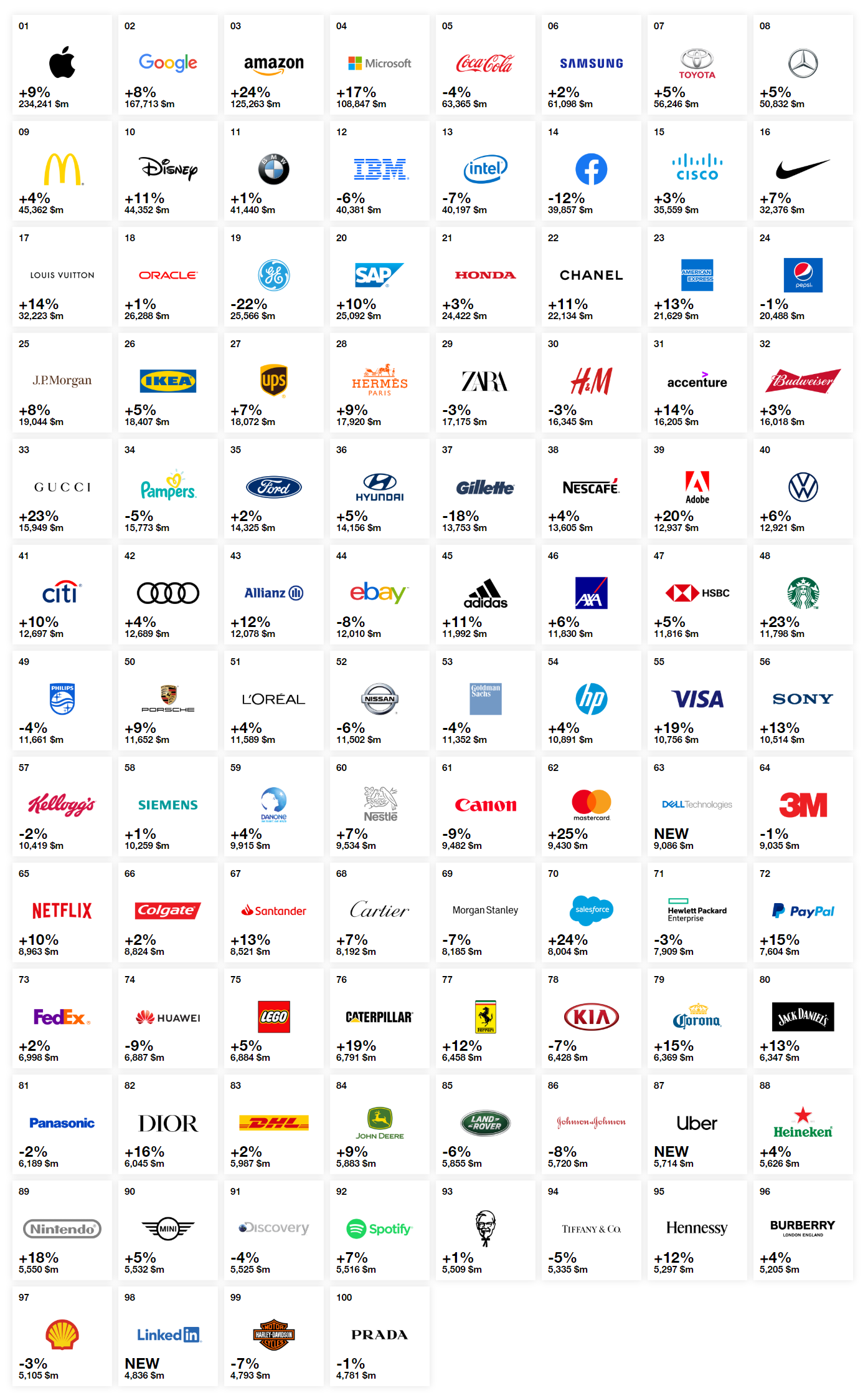 Компания Coca-Cola, которая ранее длительное время занимала первое место, в 2019 году сохранила за собой прошлогоднюю пятую позицию, несмотря на то что стоимость компании каждый год неизменно снижается. Стоимость бренда Facebook снизилась на 12% до почти 40 млрд долларов, в результате чего бренд покинул прошлогоднюю девятую позицию, опустившись на четырнадцатую строчку. Новичок «горячей десятки» Disney поднялся с той же четырнадцатой позиции на десятую.