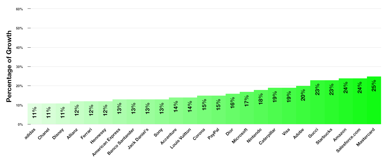 Самый высокую динамику роста бизнеса в 2019 году показал бренд Mastercard (+25%), который поднявшись на восемь позиций занял шестисят восьмую строчку рейтинга. Высокий уровень роста помимо упомянутых Disney и Amazon, показали Saleforece.com (+24%) и Starbucks (+23). Это позволило этим брендам подняться на пять и девять позиций и занять семидесятое и сорок восьмое места соответственно.