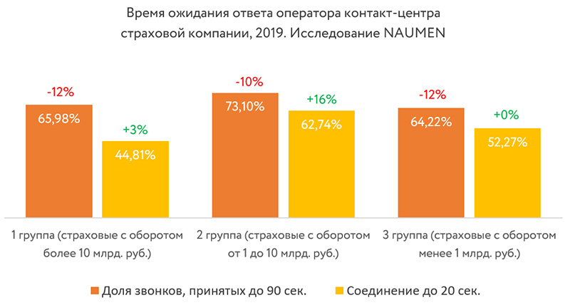 По результатам более двух тысяч контрольных звонков в контактные центры семидесяти шести российских страховых компаний, выяснилось, что среднее время на обращение клиента в России составило 38 секунд. Это значительно меньше, чем в США (60 секунд), однако, общие показатели доступности за текущий год снизились на 12%. Так, в 2018 году доля звонков, которые были приняты в пределах полутора минут, составляла 79%, в то время как в 2019 году – только 67%. В то же время, доля звонков, которые были приняты за двадцать секунд, в нынешнем году больше, чем в прошлом. Особенно это касается страховых компаний с оборотом от одного до десяти миллиардов рублей.