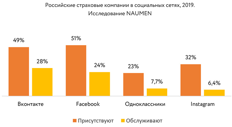 Российские страховщики часто имеют страницы в соцсетях, однако, используют их в основном для маркетинга. Так, в Вконтакте и Facebook присутствует, примерно, каждая вторая страховая компания, однако, «решить вопрос» там смогут лишь избранные клиенты. Самой «маркетинговой» можно считать платформу Instagram, где могут ответить на вопрос клиента лишь 6,4% от всех изученных компаний, в то время как страницу там имеет каждая третья.
