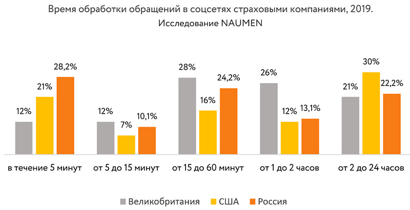 Несмотря на то, что российские страховые компании предоставляют консультации клиентам не всегда, получается это у них достаточно быстро. По крайней мере, по скорости реакции на запросы в социальных сетях российские страховщики выигрывают у коллег из США и Великобритании. Так, в течение пяти минут на запрос отвечает больше чем каждая четвертая компания в России, в то время как США – только одна из пяти.
