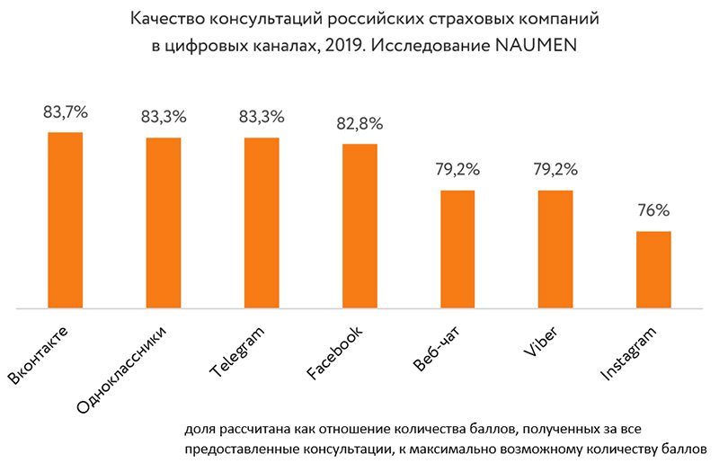 Страховые компании в России быстро и качественно консультируют своих клиентов в соцсетях, однако, такой сервис предоставляют далеко не все. Более того, страницу в самых популярных соцсетях Вконтакте и Facebook имеет только одна компания из двух, а услугу обслуживания клиентов предоставляет в лучшем случае одна из четырех. Такие выводы можно сделать на основании результатов исследования компании NAUMEN, посвященного доступности и качеству сервиса контакт-центров страховых компаний в России, а также их активности в популярных социальных сетях и мессенджерах в 2019 году.