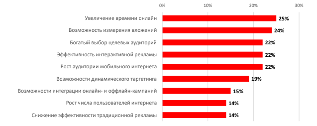 Основными драйверами роста авторы доклада назвали увеличение времени рекламы онлайн и возможность измерения вложений. Впрочем, также играет немалую роль богатый выбор целевых аудиторий, эффективность интерактивной рекламы и рост мобильного интернета.