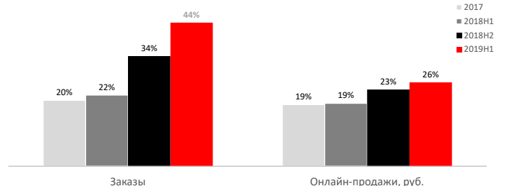 По данным Data Insight, рынок электронной торговли демонстрирует уверенный рост по числу заказов, но не по продажам. Так, в 2017 году доля заказов составляла одну пятую часть рынка, что почти соответствовало доле онлайн-продаж. Во второй половине 2019 года ситуация значительно изменилась: доля заказов выросла более чем вдвое, в то время как онлайн-продажи занимают лишь четвертую часть рынка.