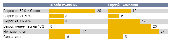 Офлайн-компании не склонны серьезно увеличивать затраты на интерактивную рекламу. Лишь одна компания из десяти увеличила в 2018 году свои расходы на этот тип продвижения более чем на 50%. Показатели онлайн-компаний, разумеется, гораздо выше, однако, при этом, одна из десяти в 2018 году свои затраты даже уменьшила.