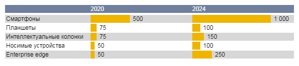 В 2020 году, а также в течение следующих нескольких лет, рост числа микросхем ИИ будет в основном зависеть от смартфонов. При этом, смартфоны далеко не единственные устройства, которые содержат чипы. Однако, все "несмартфонные" устройства в краткосрочной перспективе вряд ли окажут большое влияние на продажи микросхем, хотя бы потому что многие рынки (например, планшетов) не растут.