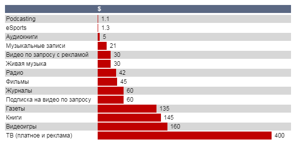 Глобальные доходы СМИ в 2020 году по категориям (миллиарды долларов США)