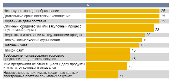 Каждый четвертый покупатель в сфере В2В меняет поставщика из-за неконкурентного ценообразования, а также из-за длительных или же вовсе сорванных сроков поставки. Также В2В байеров могут отпугнуть от сотрудничества с продавцом слабая интеграция между каналами продаж и юридически сложный закупочный процесс. Помимо очевидных требований, байеры также могут «уйти налево» из-за плохого сайта компании или же по причине «впаривания» им нерелевантных продуктов и услуг.