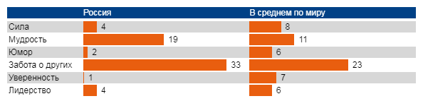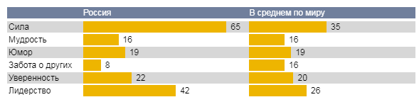 Большинство россиян (65%) считают силу мужской чертой характера, в то время как в среднем по миру данную характеристику видят мужской немногим более трети респондентов. По этому показателю Россия - однозначно впереди "планеты всей" - в других странах доля никогда не превышает половину, а в Испании силу считают «мужской» лишь 21% респондентов.