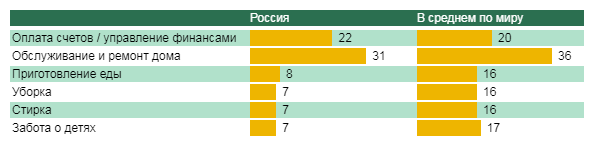 Забота о детях, стирка, уборка и приготовление еды – все эти занятия россияне видят в исполнении мужчин значительно реже, чем в других странах. Другое «дело по хозяйству», ремонт дома - мужское занятие по мнению лишь трети респондентов (например, в Чили – 59%), а 9% россиян и вовсе считают что у этого дела женское лицо.