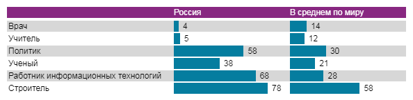 В России чаще (а иногда и значительно) чем в других странах видят мужскими профессии политика, ученого и работника информационных технологий. Причем, разница зачастую выглядит ужасающей. Например, информационные технологии считают мужским занятием 68% россиян, в то время как в США только каждый четвертый, а в Сербии, которую также можно считать достаточно гендерной страной, доля составила лишь 37%. Похожая картина наблюдается и с по отношению к политикам, которых в России также видят мужчинами более половины респондентов, в то время как в Нидерландах – лишь 17% респондентов.
