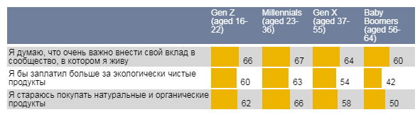 Молодые люди больше озабочены ответственным потреблением, чем пожилые. При этом людей старшего возраста также достаточно часто волнуют проблемы экологии, однако, переплачивать за органические продукты они готовы несколько реже. Также результаты отчета globalwebindex Corporate Social Responsibility (Корпоративная социальная ответственность), посвященного особенностям ответственного потребления, показали низкую мотивацию на покупку дружественных окружающей среде продуктов среди россиян.