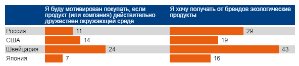 Почти каждый третий россиянин хотел бы получать от брендов экологические продукты, в то время как в США – только один из пяти. При этом в Швейцарии доля составляет 43%, а в Австрии высокие экологические требования к брендам предъявляет почти каждый второй респондент.
