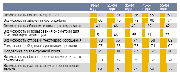 Пообщаться с представителем службы техподдержки посредством видеочата хотели бы меньше половины респондентов, причем, это касается людей практически всех возрастных групп. Клиенты позитивно относятся к возможности рассказать о своем затруднении с помощью скриншота, хотя данная опция больше привлекает молодых людей. Также потребители хотели бы это делать с помощью обычной фотографии, причем, доля людей среднего возраста (35-44 года) оказалась даже несколько выше по сравнению с более молодыми респондентами.